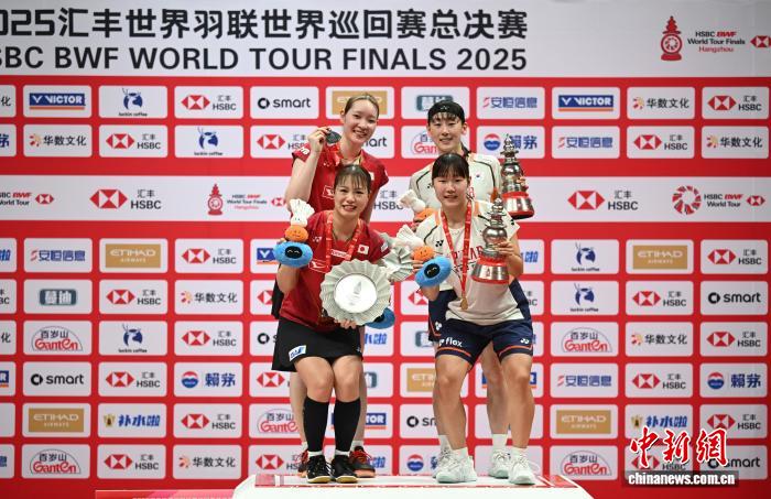 12月21日,2025寰球羽联宇宙巡礼赛总绝赛正在浙江杭州奥体中央体育馆举办,韩邦连合黑荷娜(左停)/李绍希(左上)2比0打败日原撮合祸岛由纪(左停)/紧原麻佑(左上),取得女单冠军。图为授奖典礼。中新社记者 王刚刚 摄